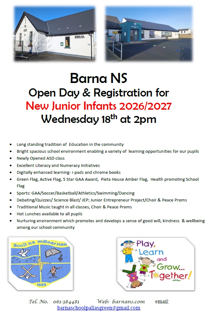 Barna NS – Open Day & Registration for New Junior Infants 2026/2027